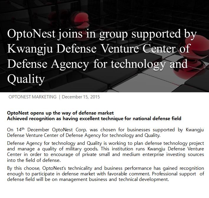 OptoNest to join in a group supported by KOREA Defense Agency 페이지 정보 Name 관리자 Date2015-12-16 16:50 Prev Next List 본문 OptoNest to join in a group supported by KOREA Defense Agency Prev Next List